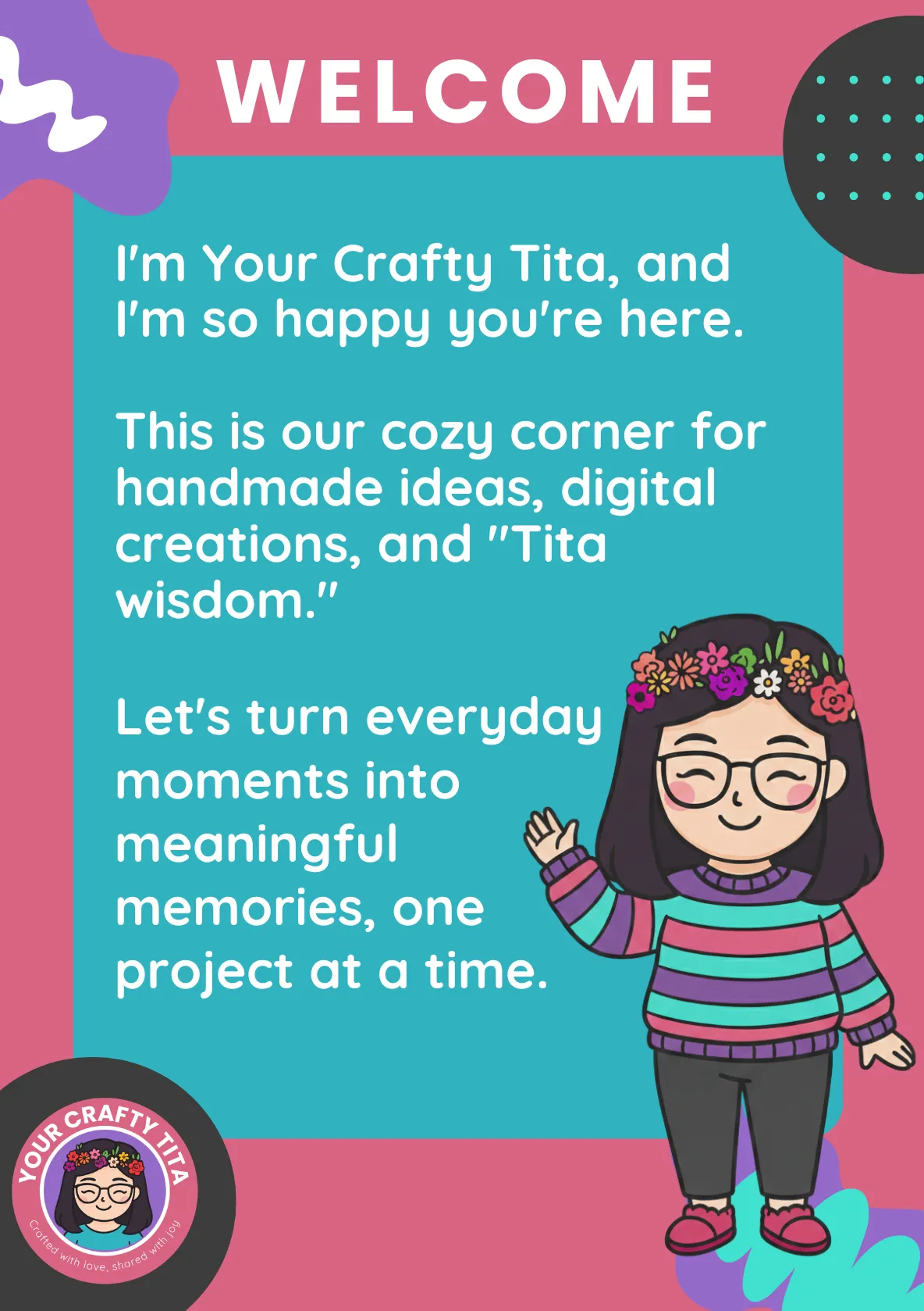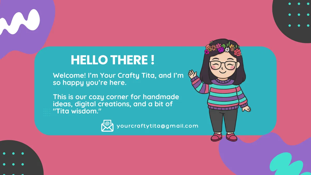 Your Crafty Tita's mission is to spread the joy of handmade creations, whether it’s a personalized gift, a DIY project, or a digital design crafted with love. I’m here to share what I know, inspire creativity, and build a cozy space where fellow crafters feel encouraged to make, learn, and express themselves. Through tutorials, thoughtful designs, and a sprinkle of Tita wisdom, I hope to turn everyday moments into meaningful memories, one craft at a time.